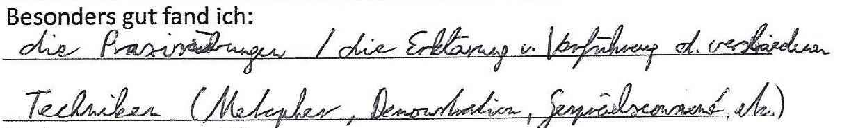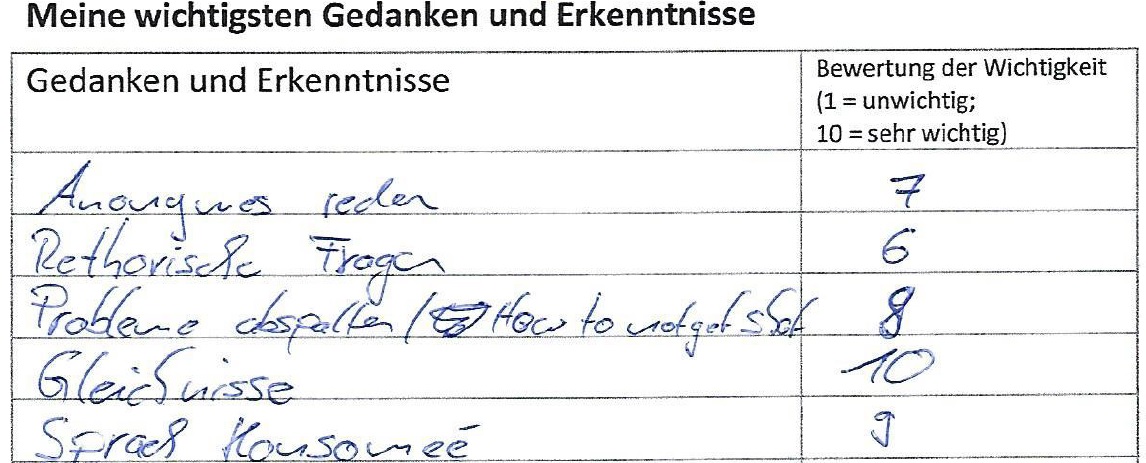 die Praxisübungen/ die Erklärung und Vorführung d. verschiedenen Techniken (metapher, Demonstration, Gesprächsconsommé, etc...)